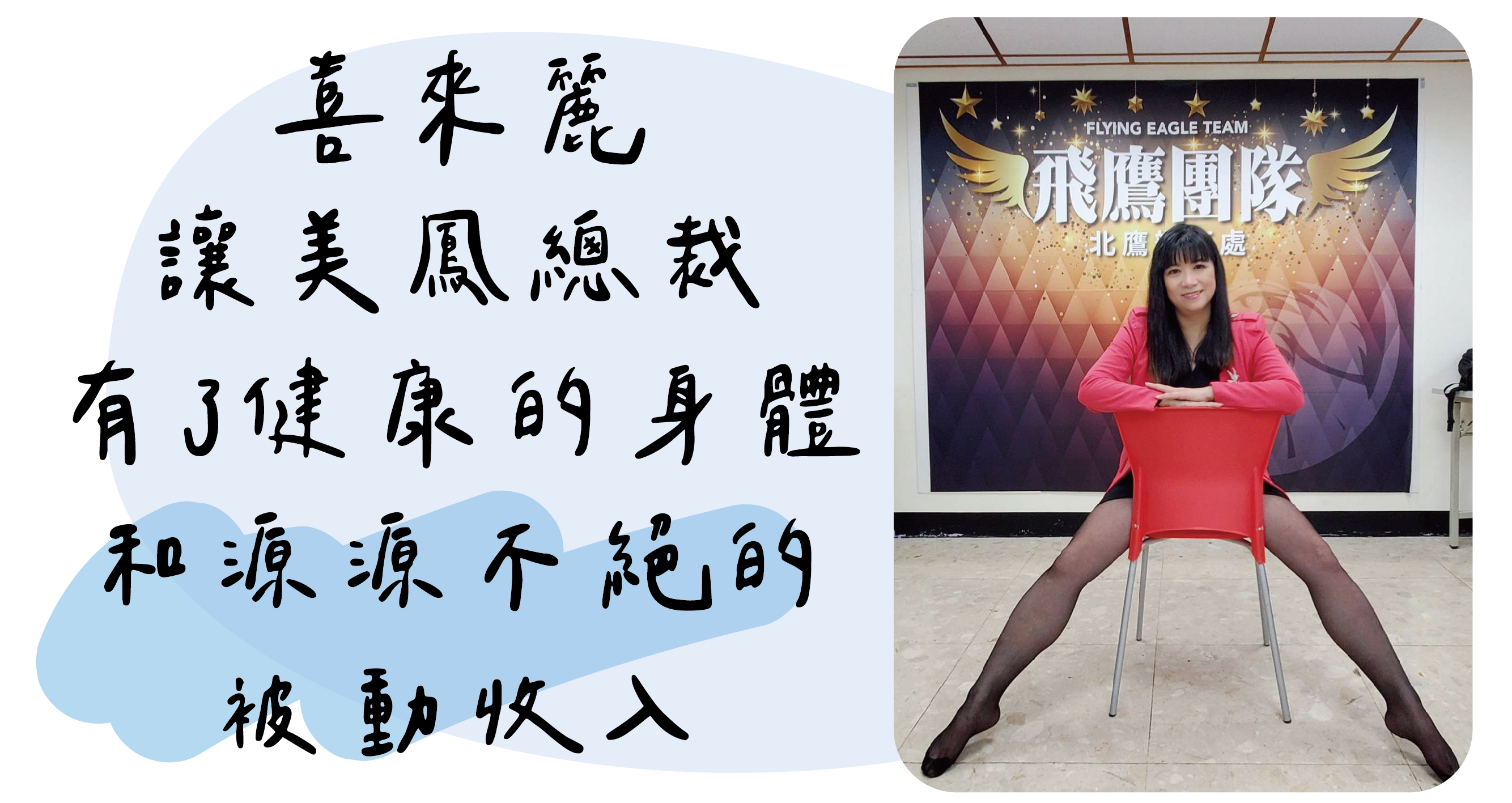 由於先前的投資失利,同學直銷惡意欺騙,美鳳總裁對於直銷產業非常排斥及抗拒,在台積電同事分享喜來麗事業時一開始她堅決拒絕,直到親眼見證同事的客戶健康狀況改善許多,她好奇之下才主動進公司了解產品,原本身體長期服藥的健康問題都獲得了改善,因為有了滿滿正能量的飛鷹團隊,每天笑容滿面幸福開朗。因為經營不用錢,能讓美鳳總裁無後顧之憂的開創自己的新事業,一開始抱持著分享加減有收入的心態經營,後來團隊逐漸壯大,被動收入持續不斷的增加,還有退休金可以領,累積下來已經遠遠超過在台積電的退休金,而且每兩年複利滾存,現在已有了一筆不小的金額。