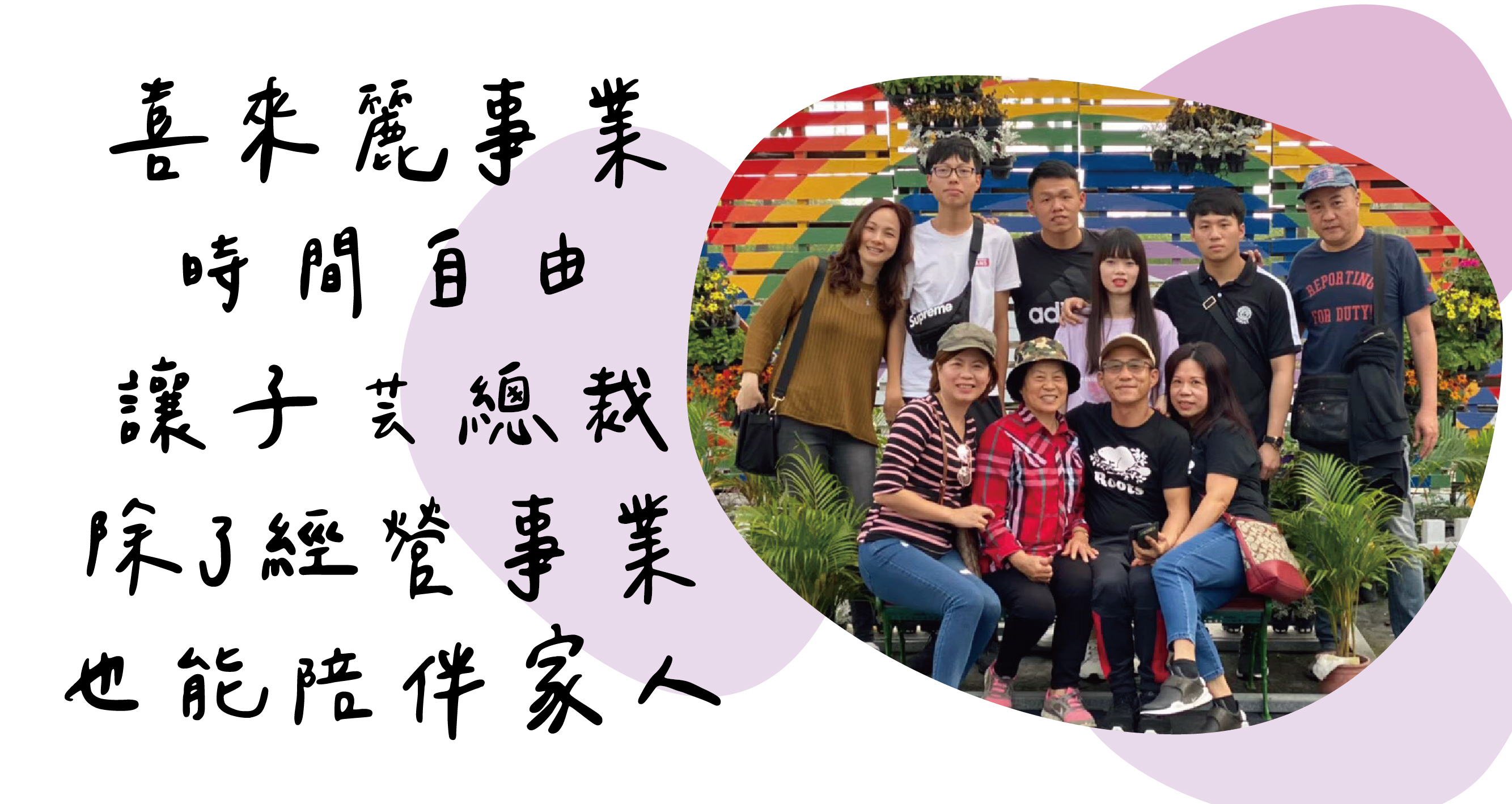 一番成績後,子芸總裁決定每固定一段時間就南下回屏東陪伴家人,在一次機緣下,媽媽和弟弟開始幫她介紹客戶,意外開啟了她在南部的事業版圖,現在回屏東不但是為了家人也是為了事業,看見媽媽如此認同自己現在的工作,也受惠於喜來麗的產品,讓她確信堅持下去的選擇沒有錯。